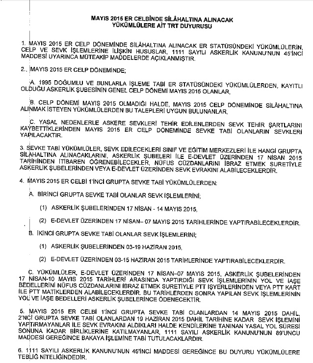 Mayıs 2015 er celp döneminde silah altına alınacak er statüsündeki yükümlülerin, celp ve sevk faaliyetlerine ait tebliğ yerine geçecek duyuru.