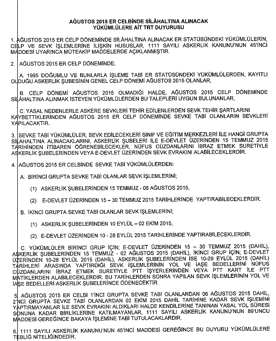 Ağustos 2015 er celp döneminde silah altına alınacak er statüsündeki yükümlülerin, celp ve sevk faaliyetlerine ait tebliğ yerine geçecek duyuru.