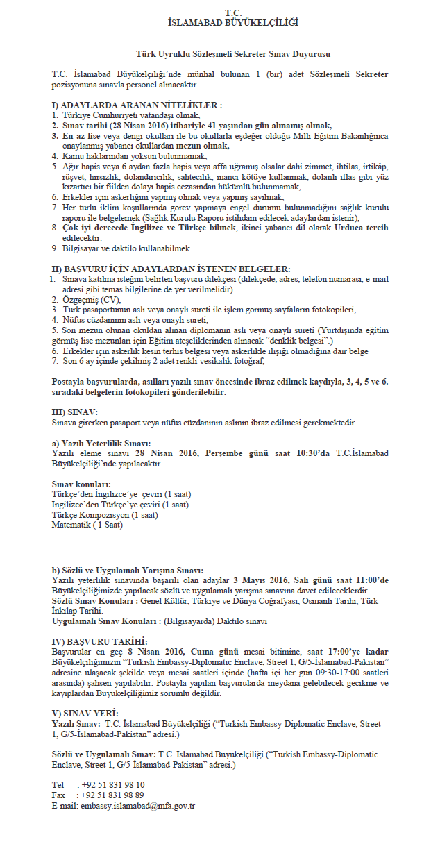 Türk Uyruklu Sözleşmeli Sekreter Sınav Duyurusu