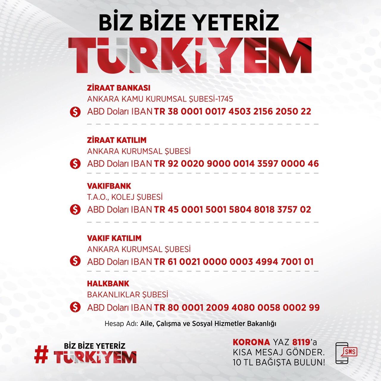 Bu çerçevede, anılan kampanyaya destek vermek isteyen vatandaşlarımız aşağıda sunulan Türk Lirası, ABD Doları ve Avro hesapları aracılığıyla katkılarını iletilebilirler.