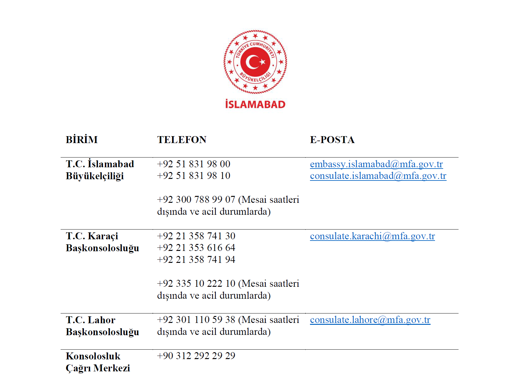 (Konsolosluk konuları ve randevu işlemleri için: consulate.islamabad@mfa.gov.tr